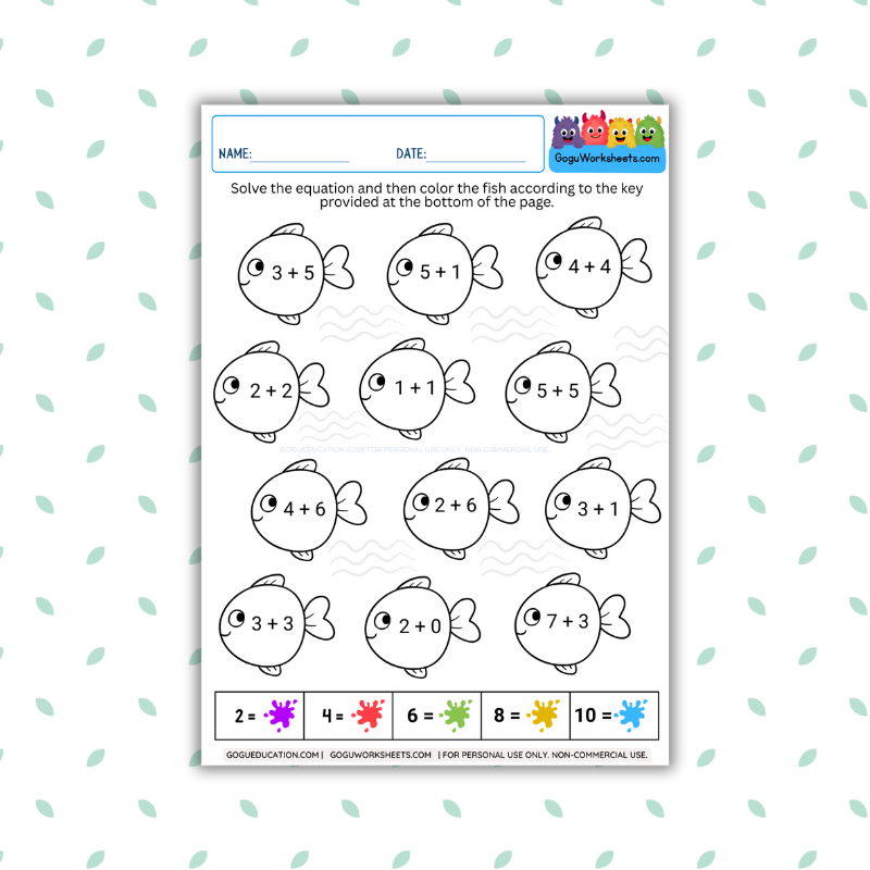 “Color by Number – Addition” Fish Worksheet is a playful and educational resource that helps children practice basic addition while improving color recognition and fine motor skills. With each fish containing a simple math problem, students solve the equation and then color the fish according to the key provided at the bottom of the page.